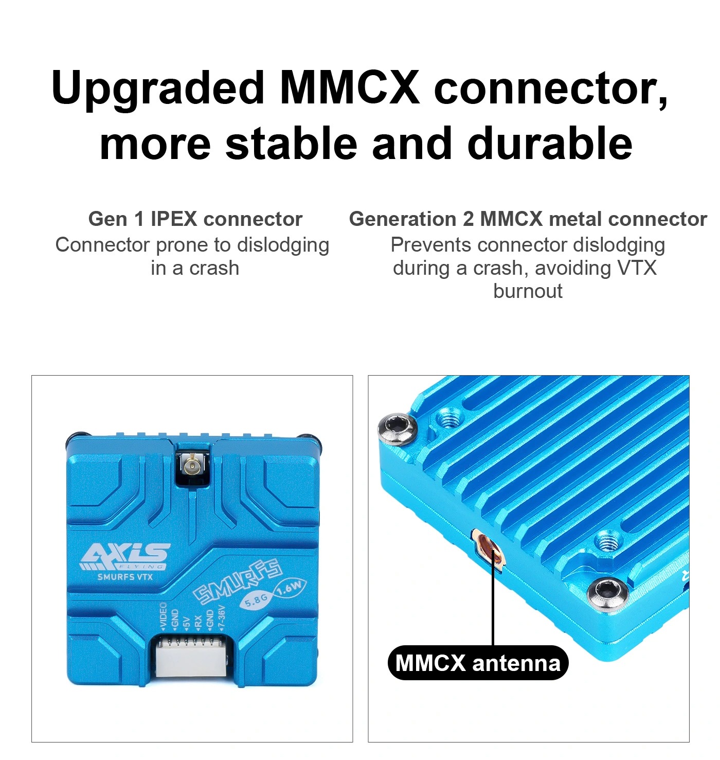 The Axisflying SMURFS V2 5.8G 1.6W FPV VTX delivers powerful, stable video transmission with a CNC unibody heatsink that maximizes heat dissipation for consistent high-performance flights. Featuring an upgraded Generation 2 MMCX metal connector for enhanced durability, secure antenna connection, and crash resistance, this compact 30×30mm powerhouse ensures reliable signal output and long-lasting performance for demanding FPV pilots pushing limits every flight.