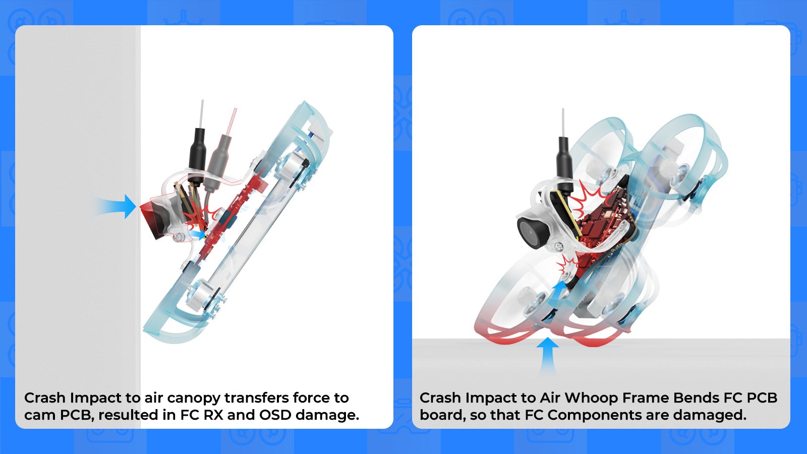 The Matrix 1S 5IN1 II FC employs a 3-point mounting system that creates cushioning space during impacts, reducing stress on core components and lowering the damage rate by up to 80%. Its 1.0mm thickened PCB and optimized layout further enhance crash resilience.