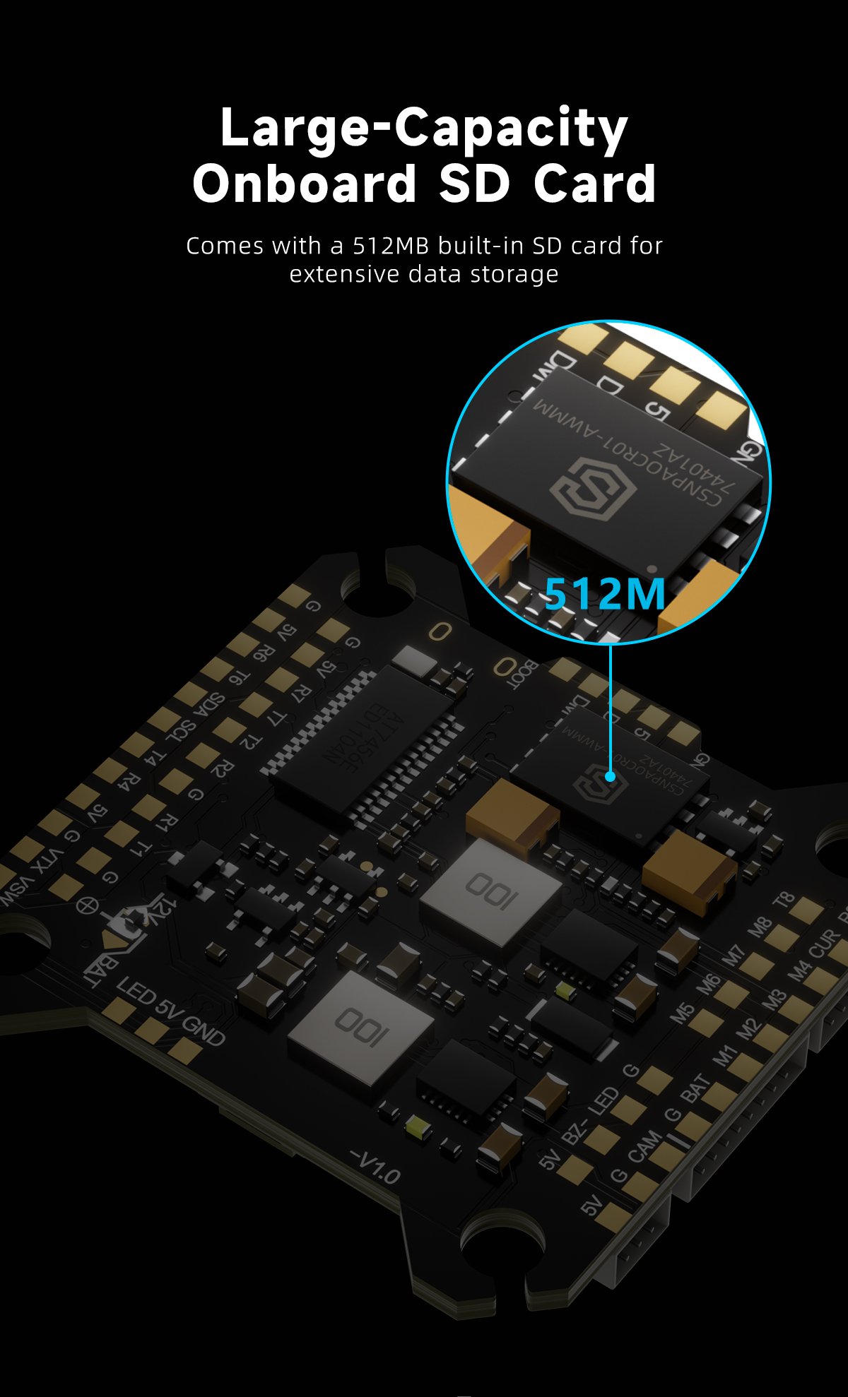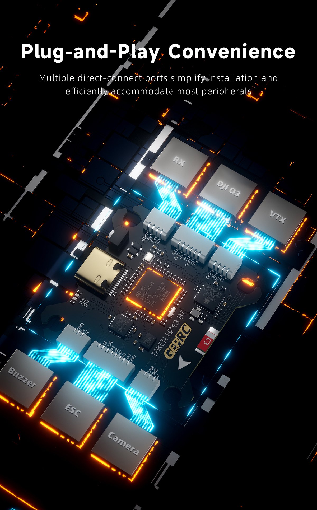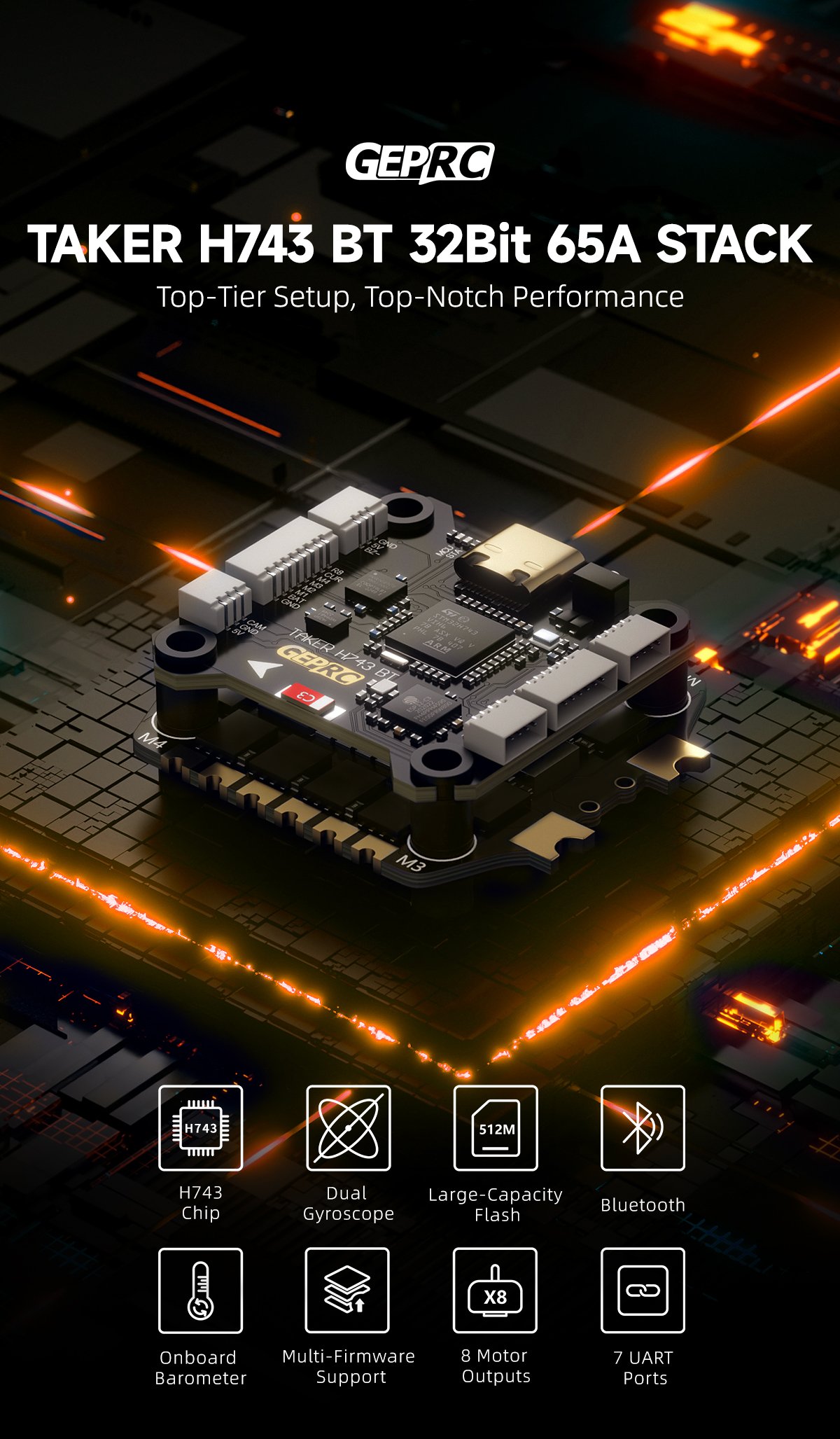 The GEPRC TAKER H743 BT 32Bit 65A Stack delivers elite flight control using a blazing fast STM32H743 processor, dual gyros, Bluetooth tuning, and massive blackbox storage for confident racing, freestyle, and cinematic builds. Paired with a smooth 65A BL32 4in1 ESC, rich BEC outputs, seven UARTs, barometer support, and broad firmware compatibility, it empowers demanding pilots with reliability, precision, flexibility, and clean power delivery across complex modern FPV systems builds.