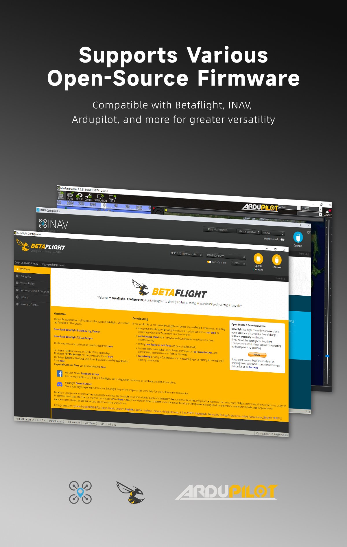 - Multi-firmware support: Betaflight, INAV, Ardupilot