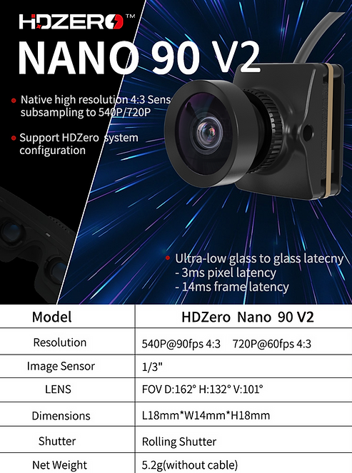 The HDZero Nano 90 V2 delivers revolutionary 90fps HDZero performance, achieving ultra low latency racing visuals that feel faster than analog while keeping pilots perfectly connected in every maneuver. With versatile resolutions, improved signal penetration, upgraded RC18D lens, and 3ms pixel latency, it empowers racers and freestylers to corner tighter, fly smoother, and dominate demanding environments with confidence across tracks, parks, and freestyle lines worldwide for competitive modern digital pilots.