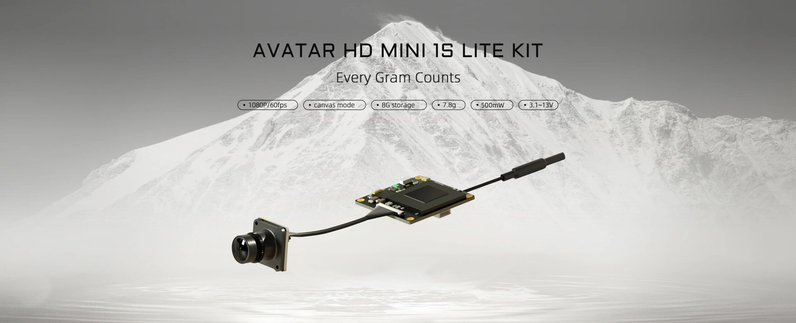 The Walksnail Avatar HD Mini 1s Lite Kit delivers ultra lightweight digital FPV performance with 1080P sixty fps clarity, twenty two millisecond latency, canvas OSD control, and powerful five hundred milliwatt output for tinywhoops and compact drones. Featuring a new mini VTX, featherlight camera, built in thirty two gigabyte storage, HDMI output, wide voltage input, and stable high definition recording, it maximizes flight time, image realism, range, reliability, and confidence.