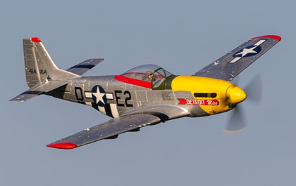 On October 7th, 1944, Urban L. Drew – also known as “Ben” Drew – became one of only three USAAF pilots to encounter the then-new Messerschmitt Me 262 jet fighter during a combat mission over enemy territory. He then became the first and only Allied pilot to shoot down two of the jet-powered aircraft while flying his personal P-51D Mustang named “Detroit Miss.” The E-flite® UMX™ P-51D Mustang is a replica of that history-making aircraft, complete with a variety of scale details, impressive handling, and outstanding performance. Exclusive Spektrum™ AS3X® and optional-use SAFE® Select technologies, along with the 2S and 3S compatible power system, deliver an unmatched ultra-micro Mustang flying experience.